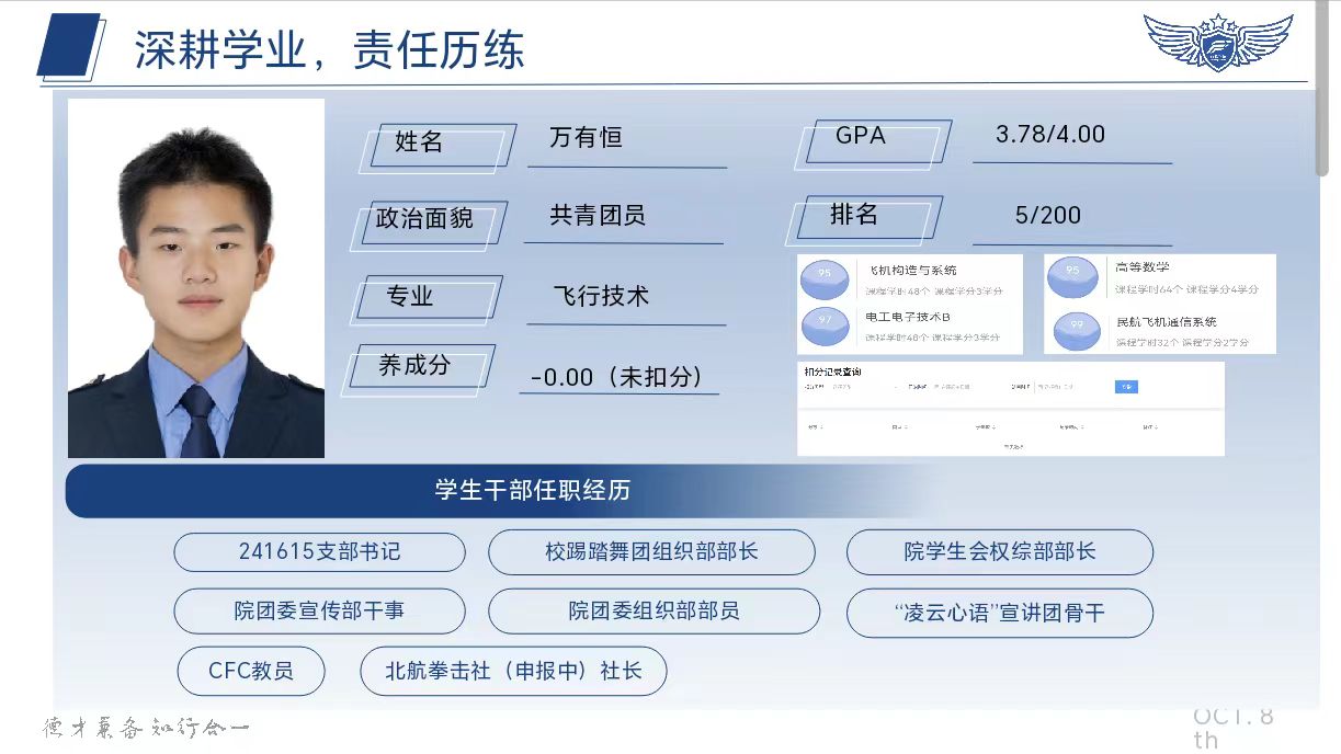 大班团支书:万有恒:共青团员,飞行技术专业,GPA 3.78/4.00,年级排名 5/200,曾担任 241615 支部书记、院团委宣传部干事、CFC 教员等职务,高分通过英语四、六级考试并免修北航英语课,还斩获全国大学生英语竞赛 C 类三等奖,CFC 入学考试与实操考试均位列前五。他在当选后表示,将以服务同学为第一宗旨,尽职尽责完成学校与学院派发的任务,不辜负师生信任。